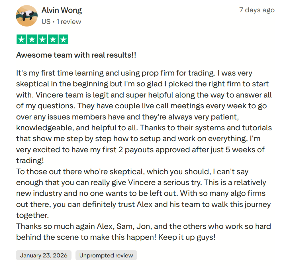 Our long-term vision for Vincere is to help traders grow from using prop firm capital to managing personal cash accounts - and ultimately scaling to institutional-level trading. Our goal is to build a fully-fledged algorithmic hedge fund for our clients, and this is just the first step.